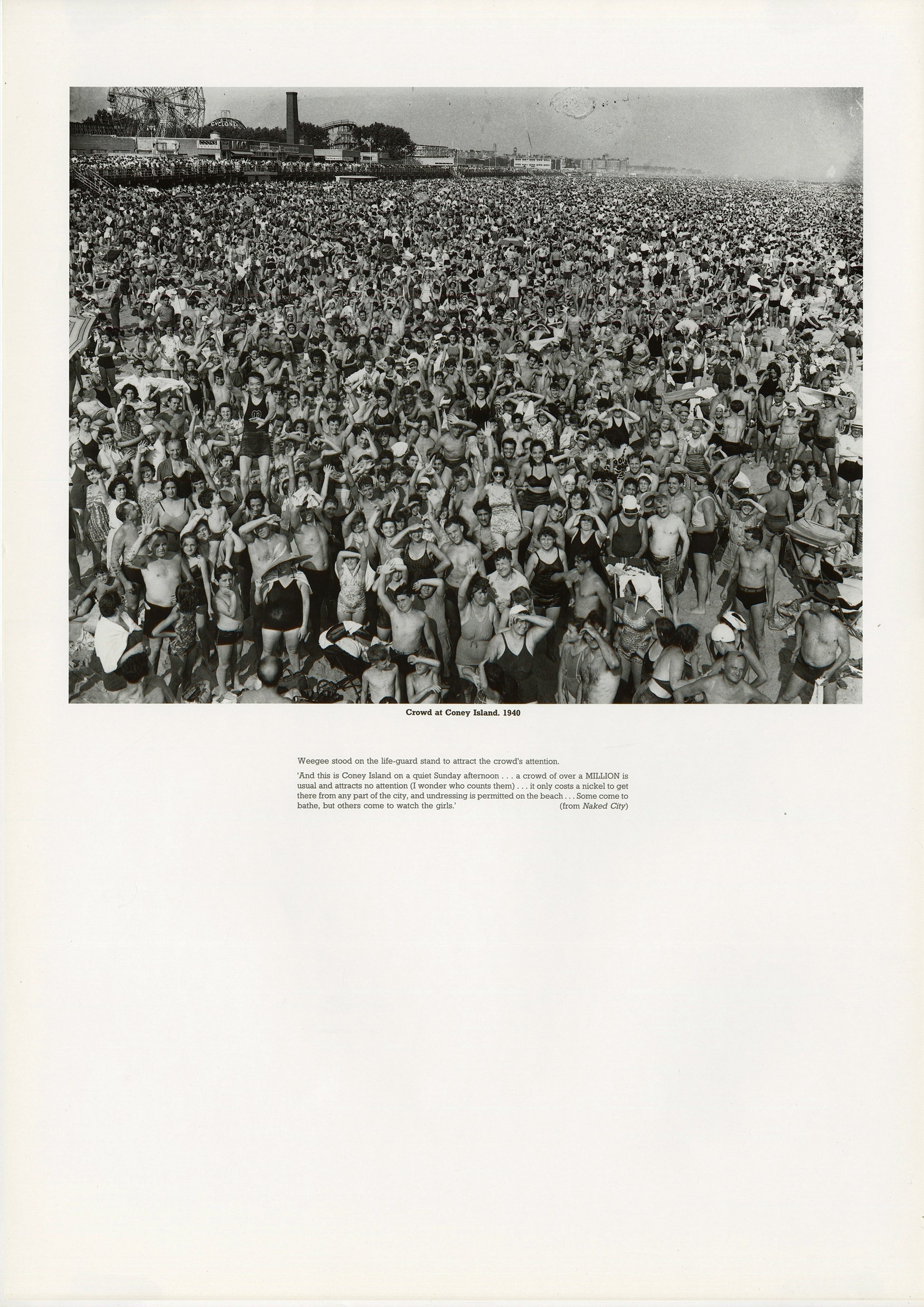 Vintage poster of iconic Weegee image, Crowd at Coney Island, 1940. Printed with a quote from Naked City explaining the taking of the image.
