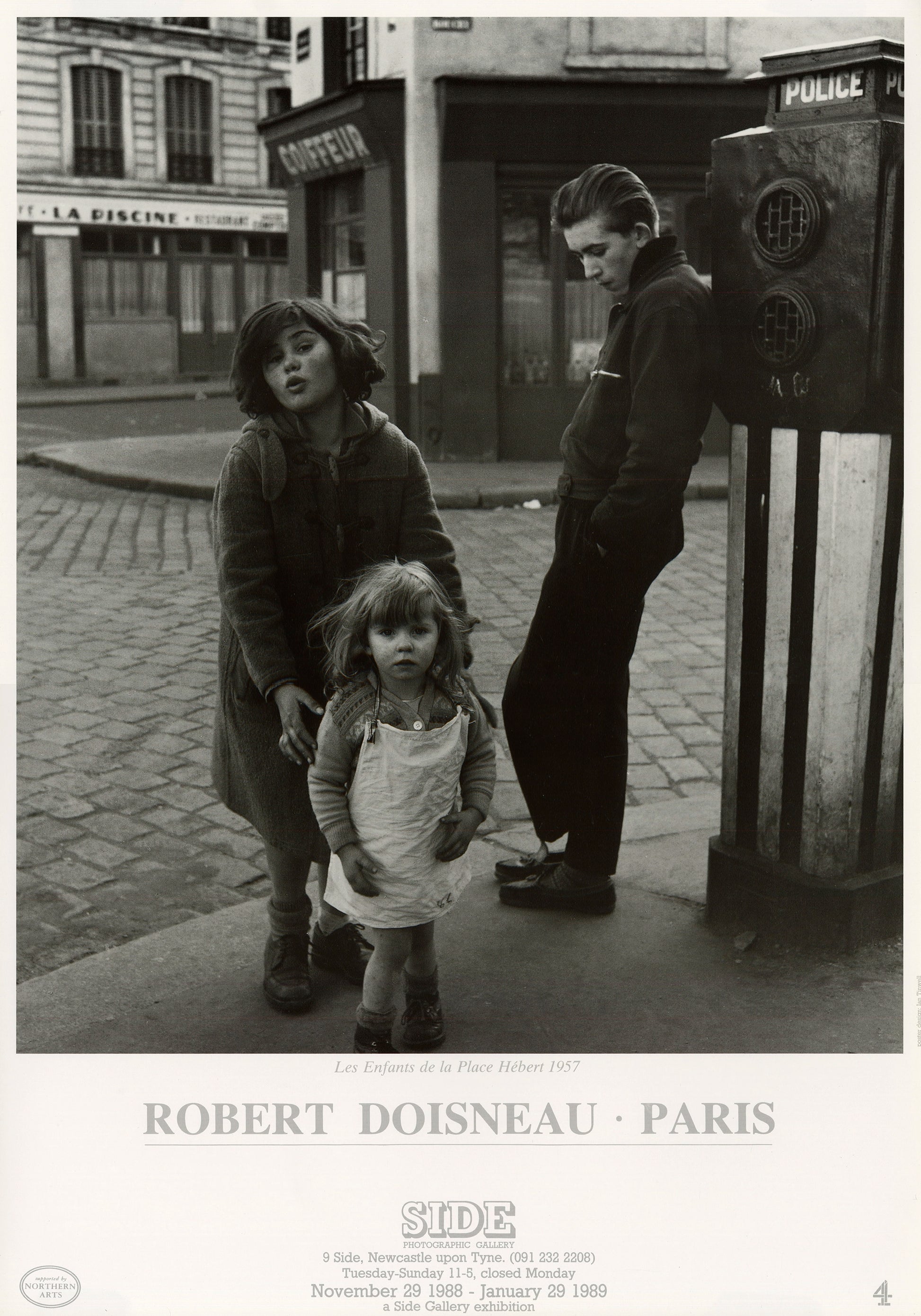 Vintage exhibition poster for the exhibition Robert Doisneau: Paris, shown at Side Gallery from November 1988 - January 1989.