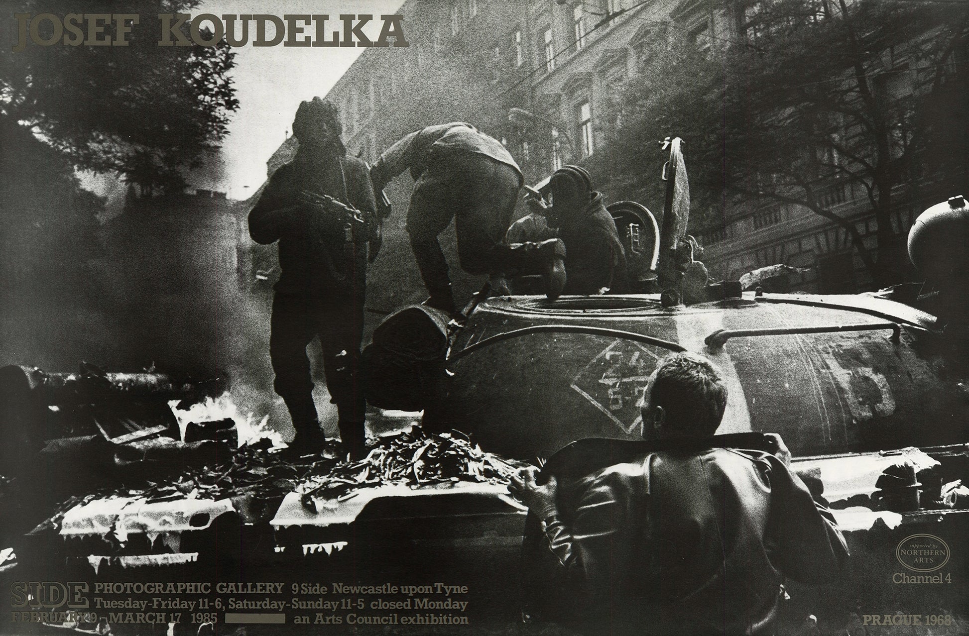 Vintage poster for the exhibition Josef Koudelka: Prague 1968, shown at Side Gallery, February - March 1985.